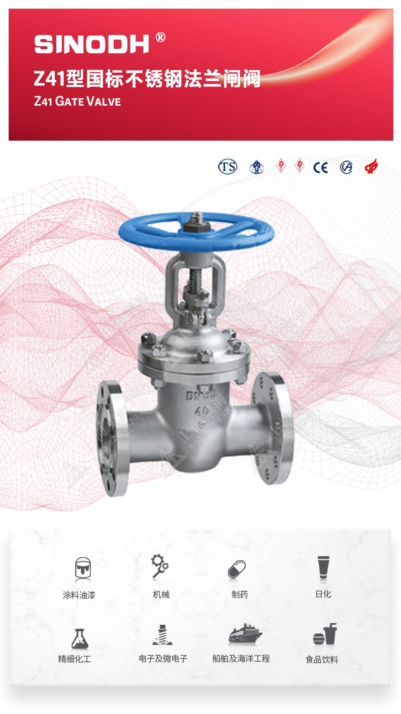 Z41型不锈钢闸阀,为球速体育在线开户app官方自主研发生产。本产品是一种最常见的启闭阀,利用闸板的上下工作来接通(全开)和截断(全关)管道中的流体介质。此类闸阀广泛用于自来水、污水、建筑、石油、化工、食品、医药、轻纺、电力、船舶、冶金、能源系统等体管线上作为调节和截流装置使用。